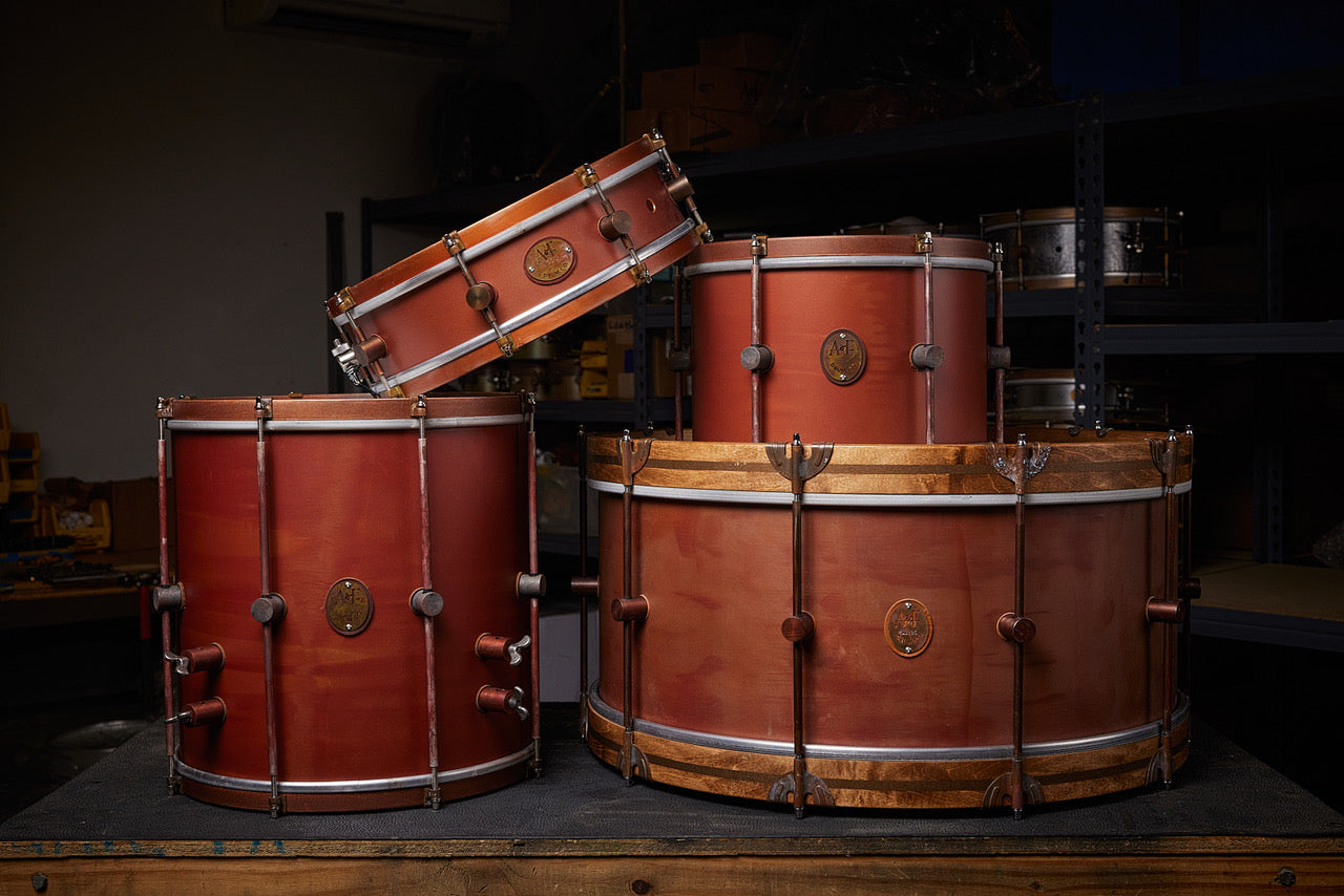 We hand cut, roll, weld, and sand our shells and hoops. Then we expedite the aging process with our proprietary patina method, we hand cut 45 deg bearing edges and snare beds then add 10 of our patented aluminum center-mounted lugs and hardware.