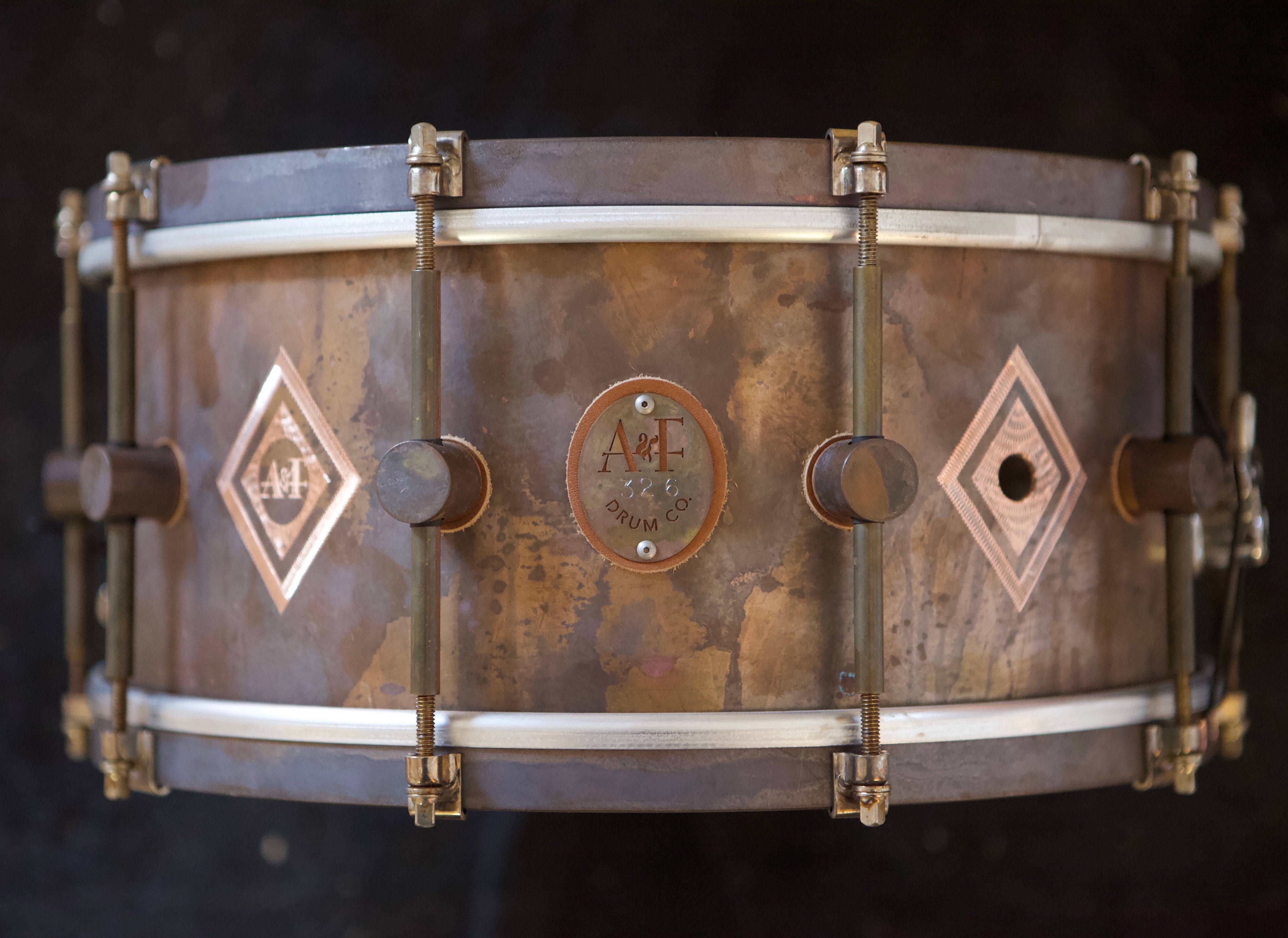 The A&F Drum Co. 6.5x14 Cooper Elite Snare with Mahogany or Copper hoops. This is a hand rolled & welded copper shell w/copper lugs, brass tubes and our exclusive mahogany or Copper hoops. It’s hand engraved by John Aldridge with 6 traditional 1930’s Full Dress patterns and either A&F logo in the center and/or initials of your choice! - Only 10 made in 2018.
