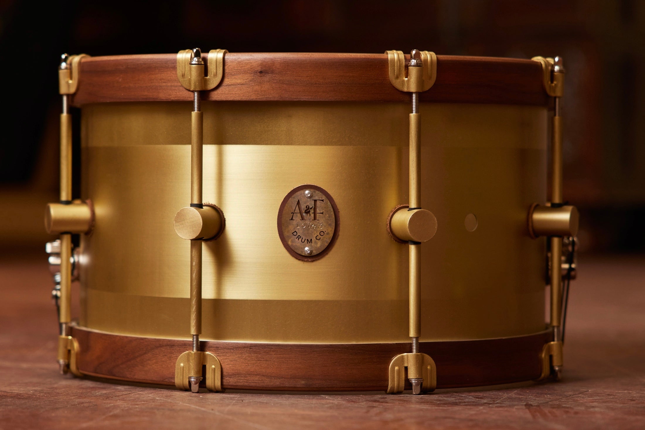 The A&F Drum Co. Royal Two-Tone Series combines sonic warmth, punch, and lightweight durability with handcrafted precision. Each drum is meticulously made using our patented raw, untreated brass shells, lugs, and hardware, paired with elegant Walnut hide-a-hoops for a truly distinctive design.