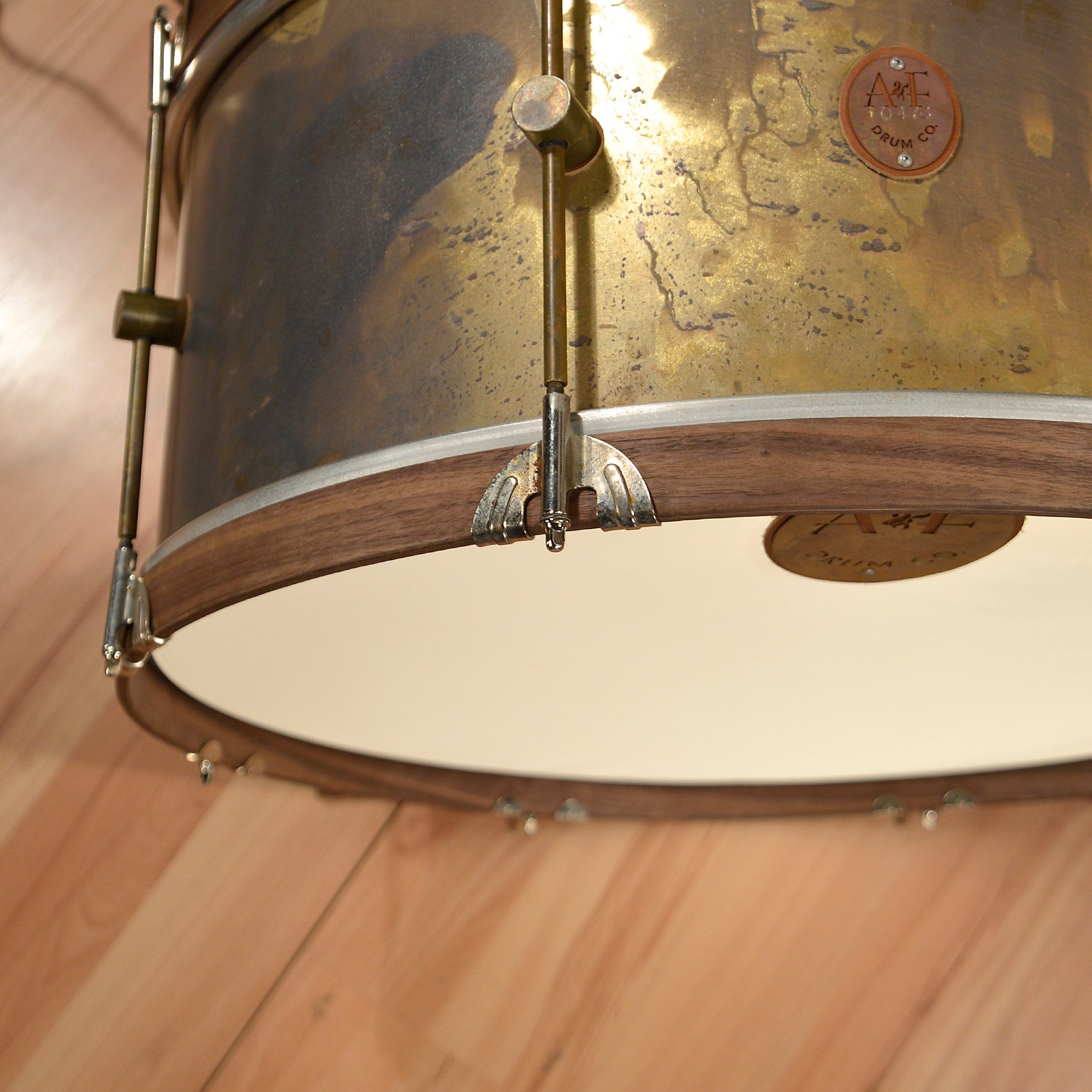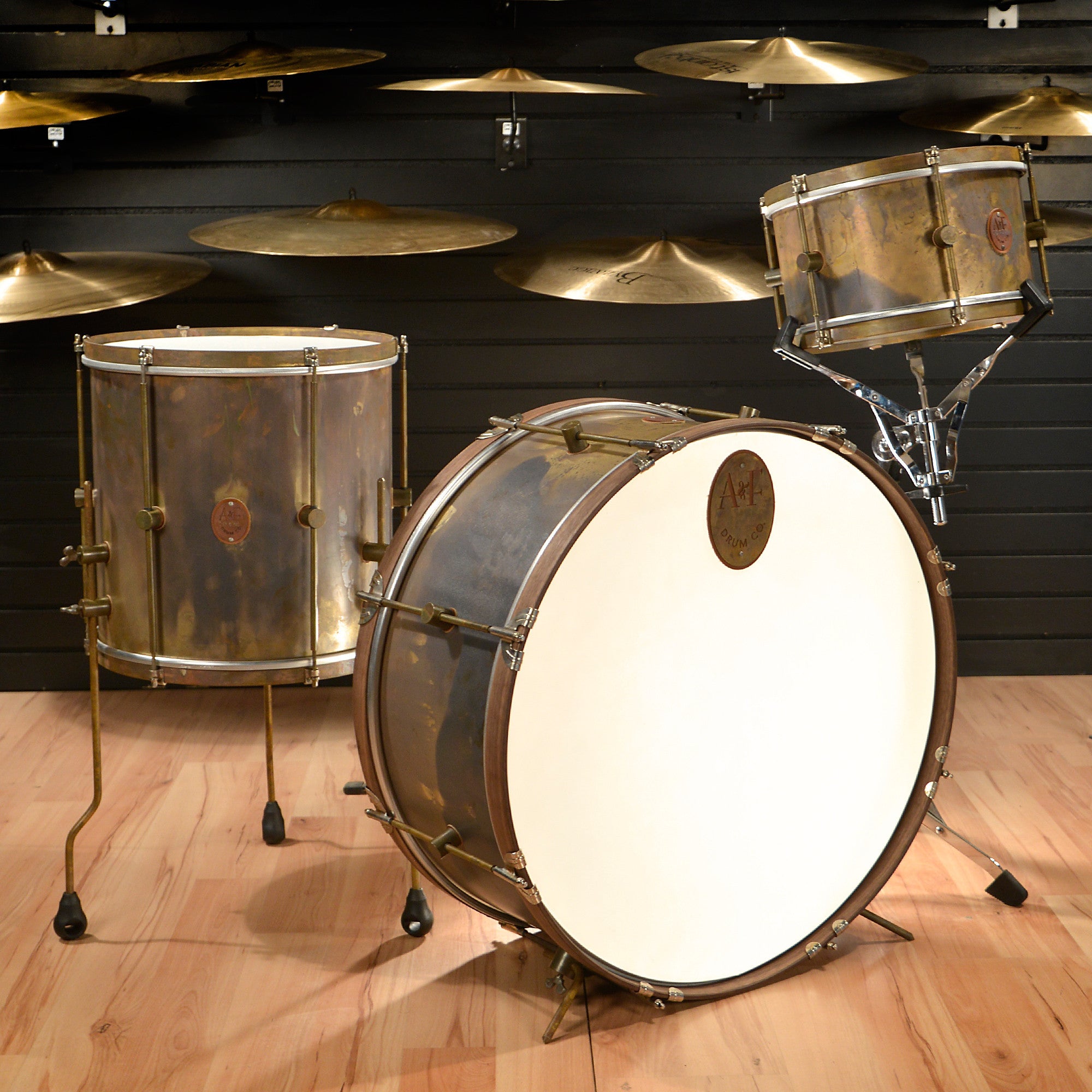 All Royal Kits are light weight and made from our patented raw brass shells, lugs, hoops, and hardware. They also come with Remo Ambassador heads. We cut, roll, weld and sand them, then treat them with our patented oxidizing formula to jump start the patina process. We cut straight 45 Degree edges and offer our custom made Walnut Hoops and Hand Engraving as upgrades. The Royal kit tunes lower then their size balanced with perfect punch, warmth, & attack AND are extremely microphone friendly!