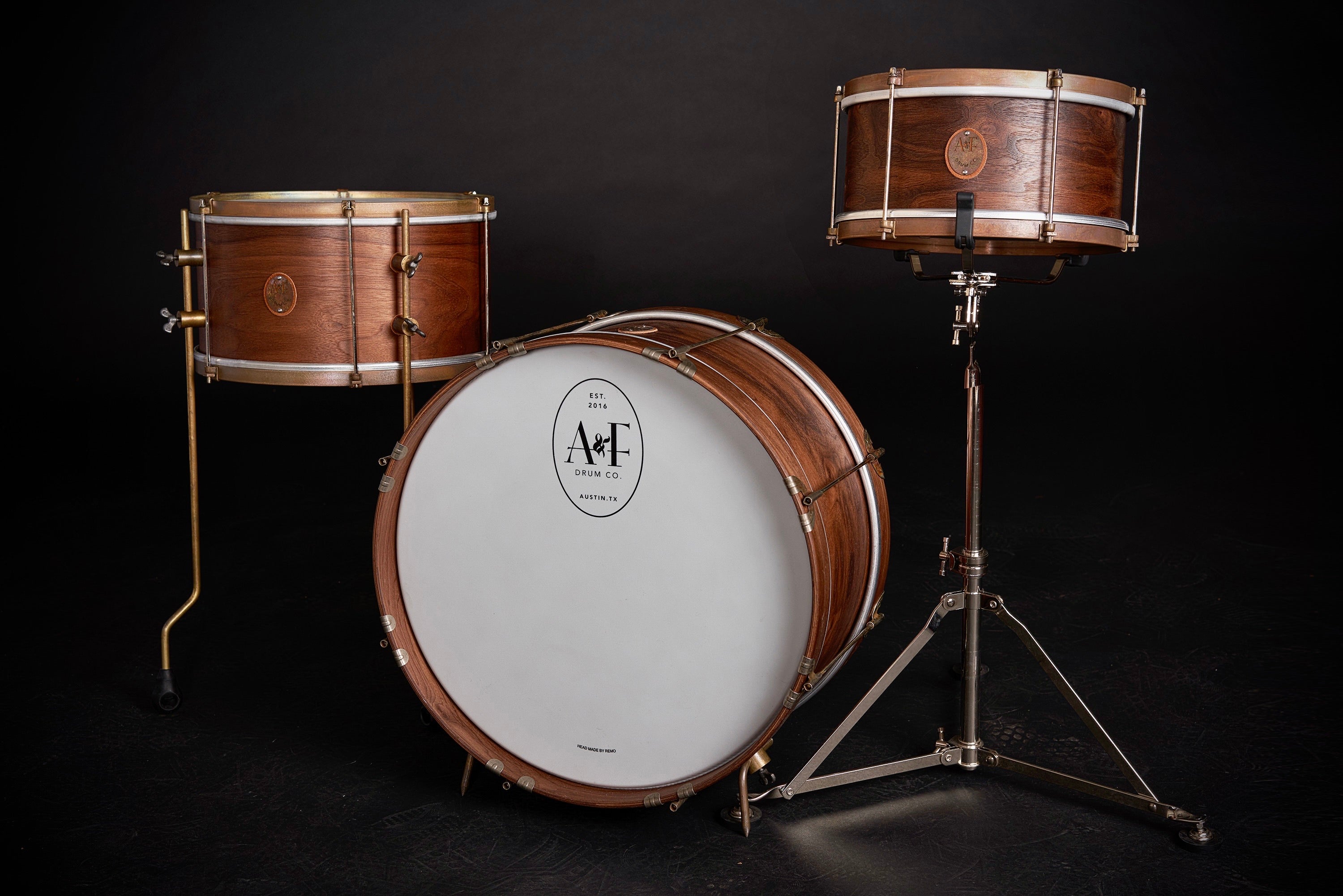 The A&F Drum Co. Single Tension Rack Toms are thin, light weight and come with 6-Lugless tension units.