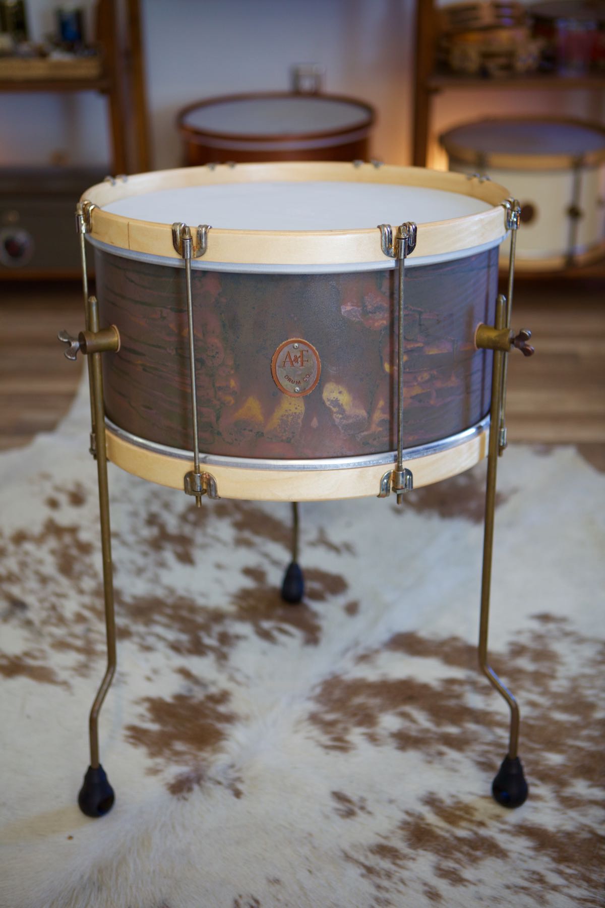 The A&F Drum Co. Single Tension Floor Toms are thin, light weight and come with 8-Lugless tension units.