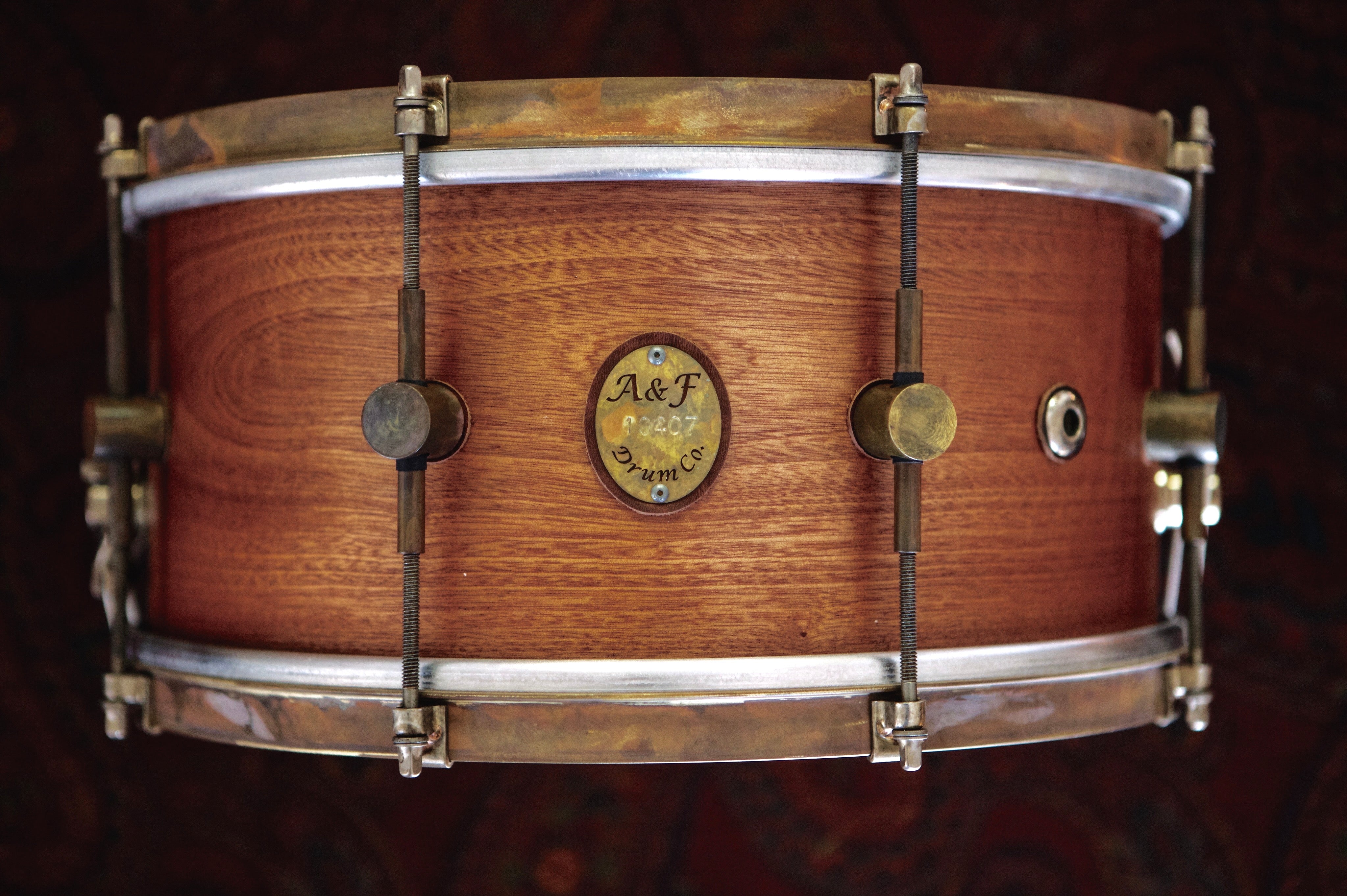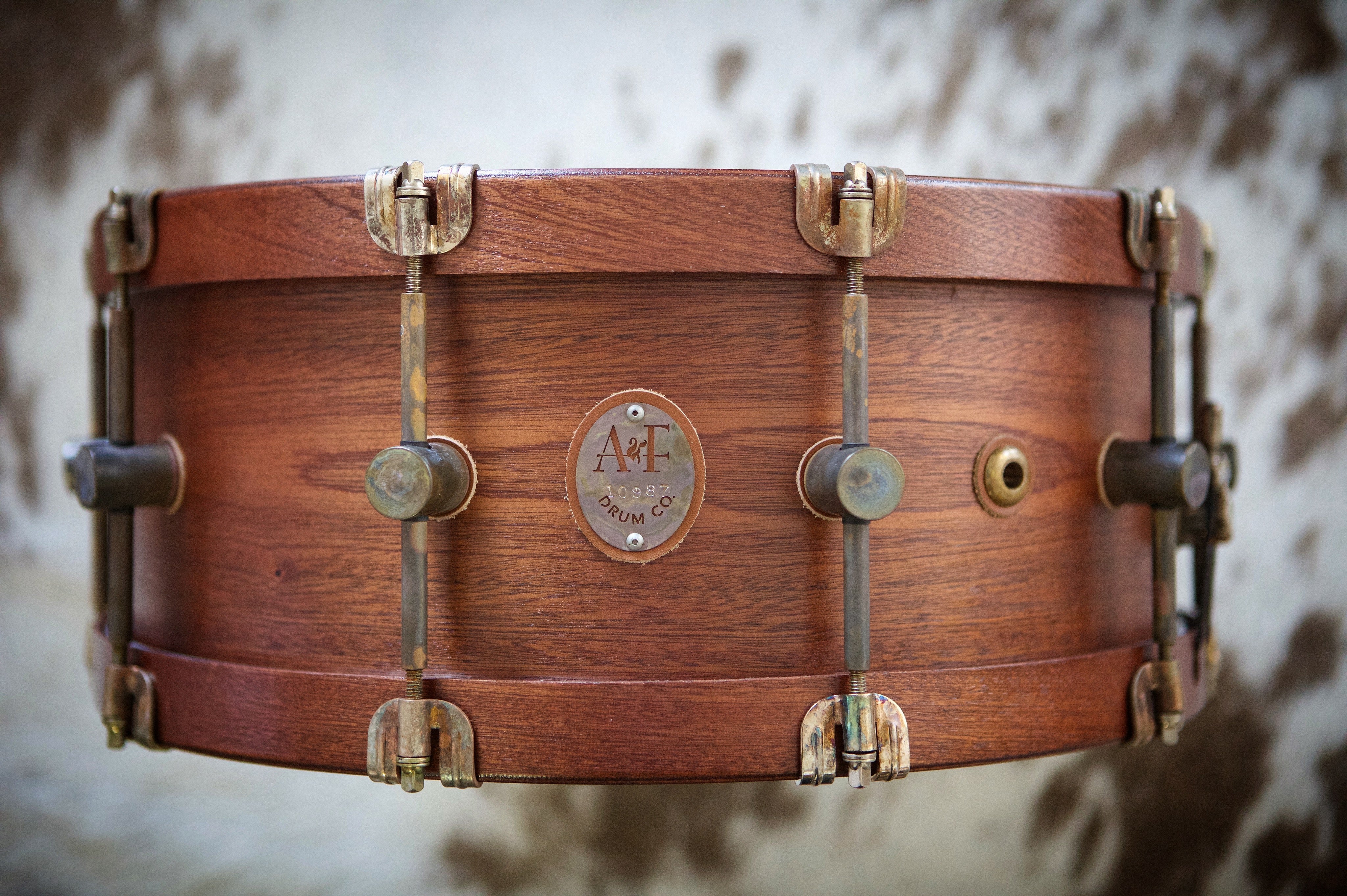 Our Mahogany Club Snare is made with our own thin mahogany/poplar shell composition, no re-rings or inside edge, our outside reverse baseball bat edge, Mahogany Wood or Raw Brass Hoops, and 10 of our patented Raw Brass Lugs. These snares have a incredible low-mid range, crisp crack, super sensitive snare response AND are extremely microphone friendly!