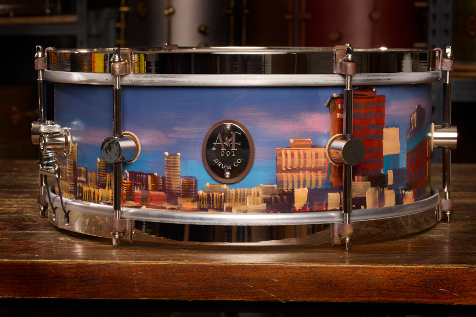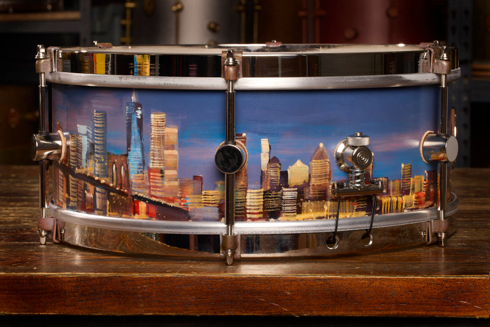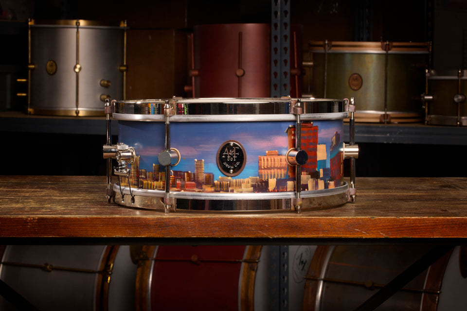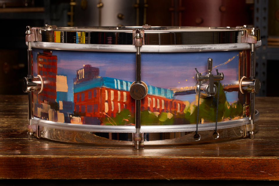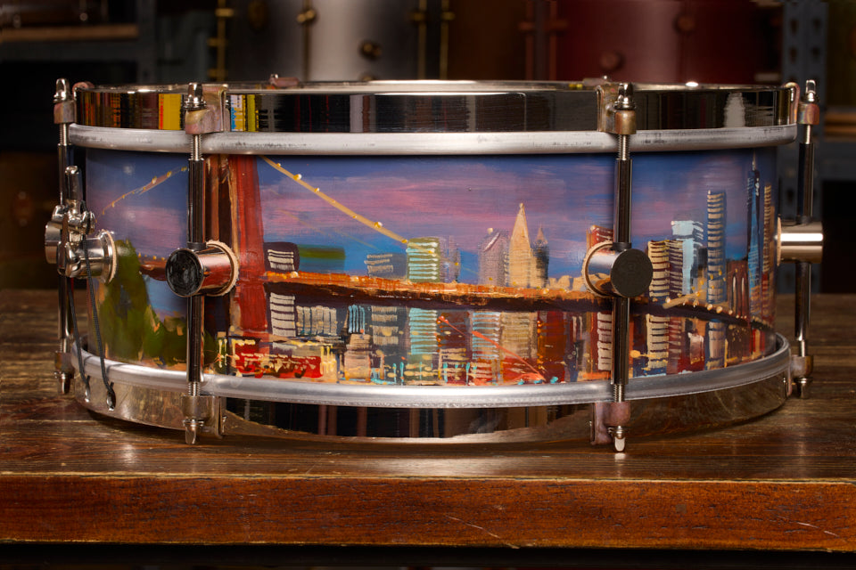 Paul Kenton is a British artist with a storied career that includes being commissioned to create three large pieces for the 2012 London Olympic Games. For this project, Paul hand-painted a vibrant cityscape, his signature subject, onto an A&F Drum Co steam-bent-maple snare drum with Nickel Over Brass hardware. Not just an extraordinary instrument but also a working piece of art.
