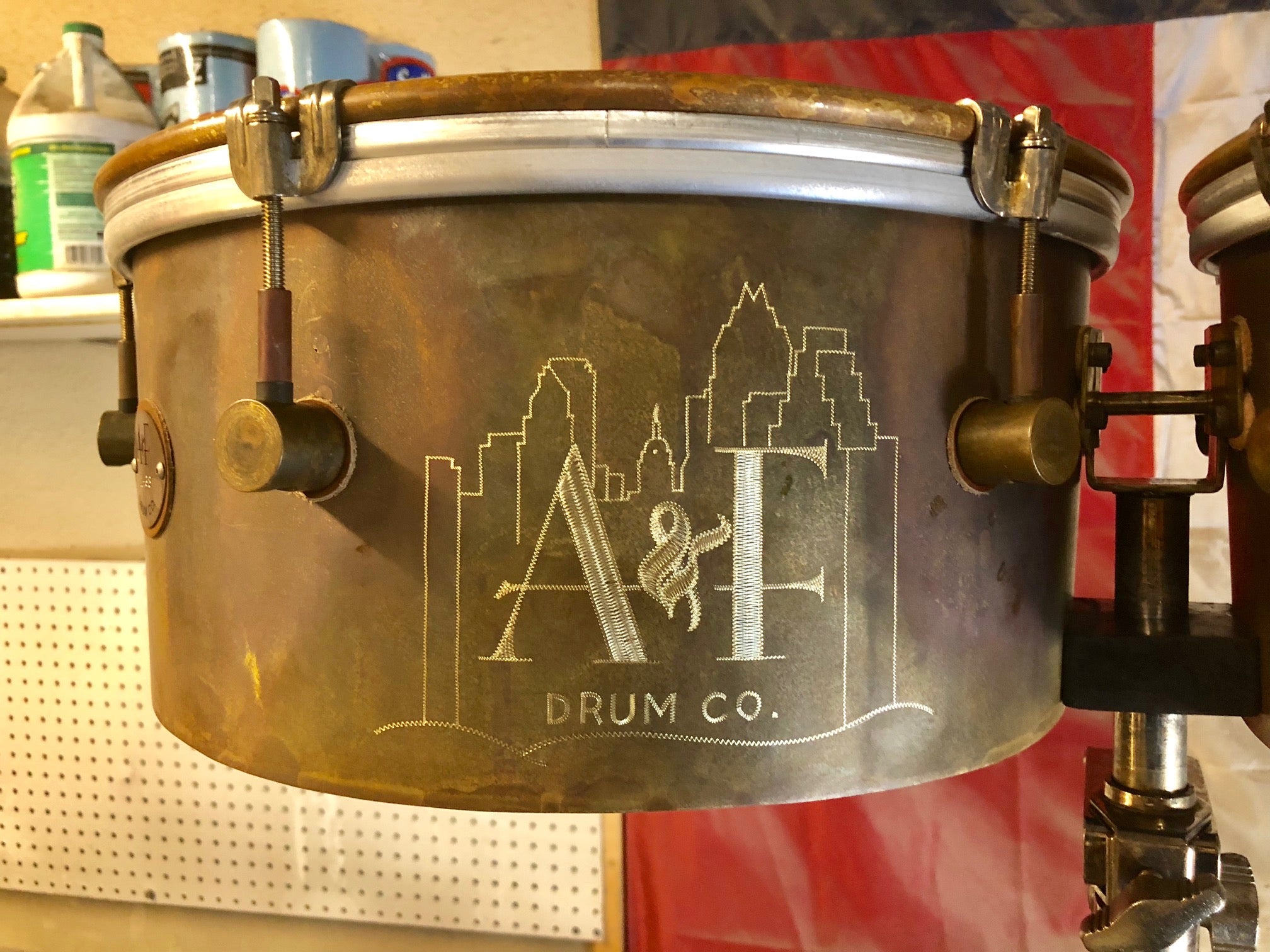 We hand cut, roll, weld, and sand our exclusive raw Brass shells and raw brass hoops, hand cut bearing edges, and treat Brass with our exclusive patina formula to jump start the aging process. Then we add our patented raw brass center-mounted lugs, hardware, and finally Remo Ambassador heads.