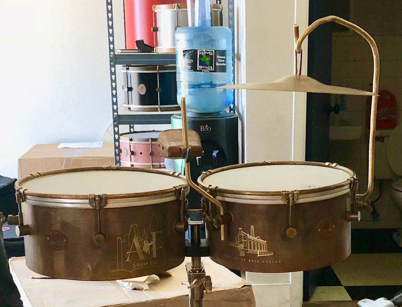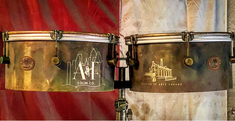 Just like all of our raw brass snares, our the A&F Drum Co. Old Havana Timbales are made from our patented Raw Brass shells, lugs, and hardware and come with our new custom straight edge Remo heads. Unlike Traditional Timbales, ours also come with internal snare mechanisms, our new Brass Ring Hoops, a L-arm bracket for mounting cow bells, and your choice of mounting bracket for your timbale stand.