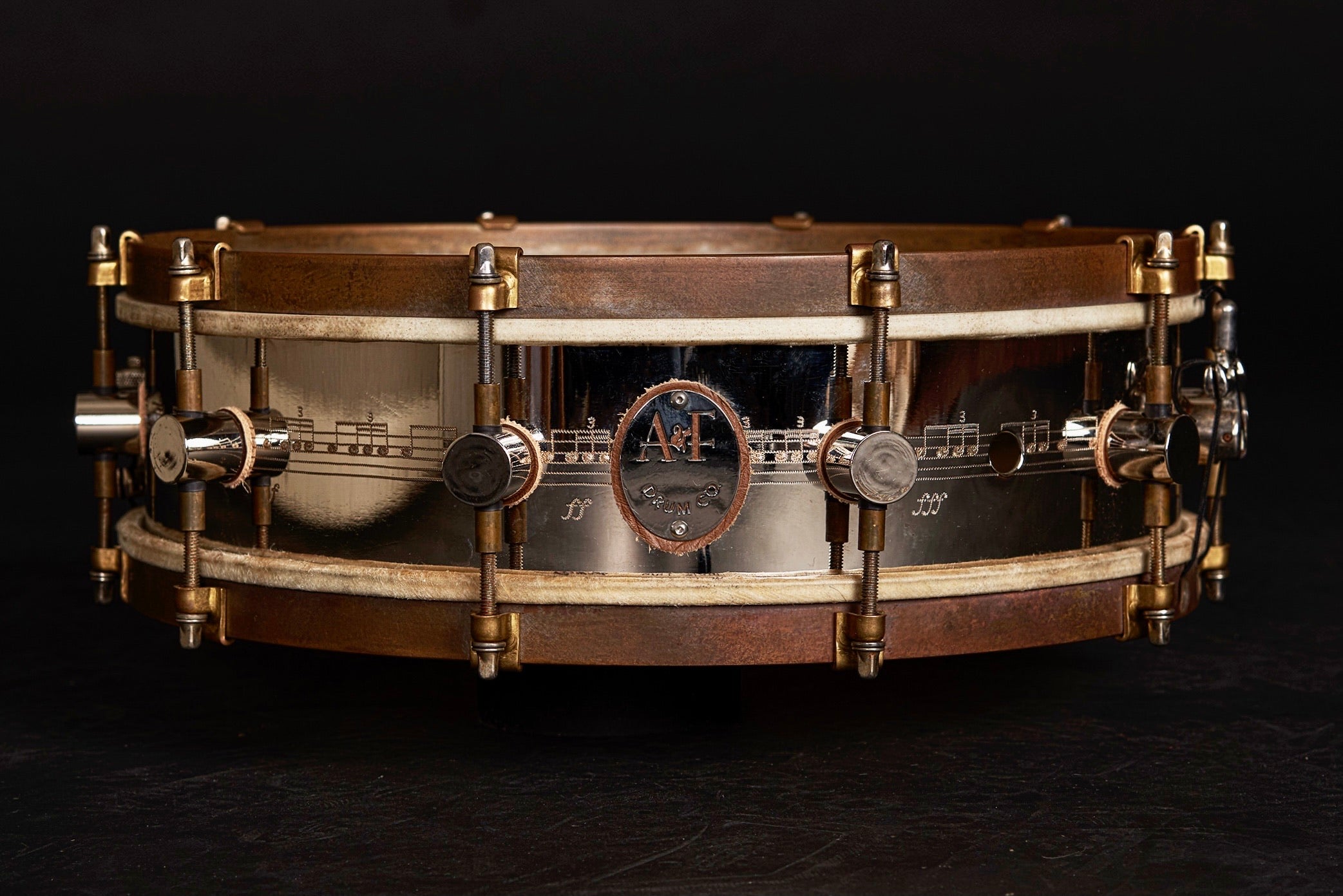 Surrounding the drum you’ll see the Bolero sheet music hand engraved by the masterful John Aldridge, which of course is where the drum draws its name!Â