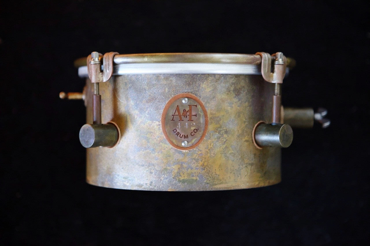We hand cut, roll, weld, and sand our exclusive raw Brass shells and raw brass hoops, hand cut bearing edges, and treat Brass with our exclusive patina formula to jump start the aging process. Then we add our patented raw brass center-mounted lugs, hardware, and finally Remo Ambassador heads.
